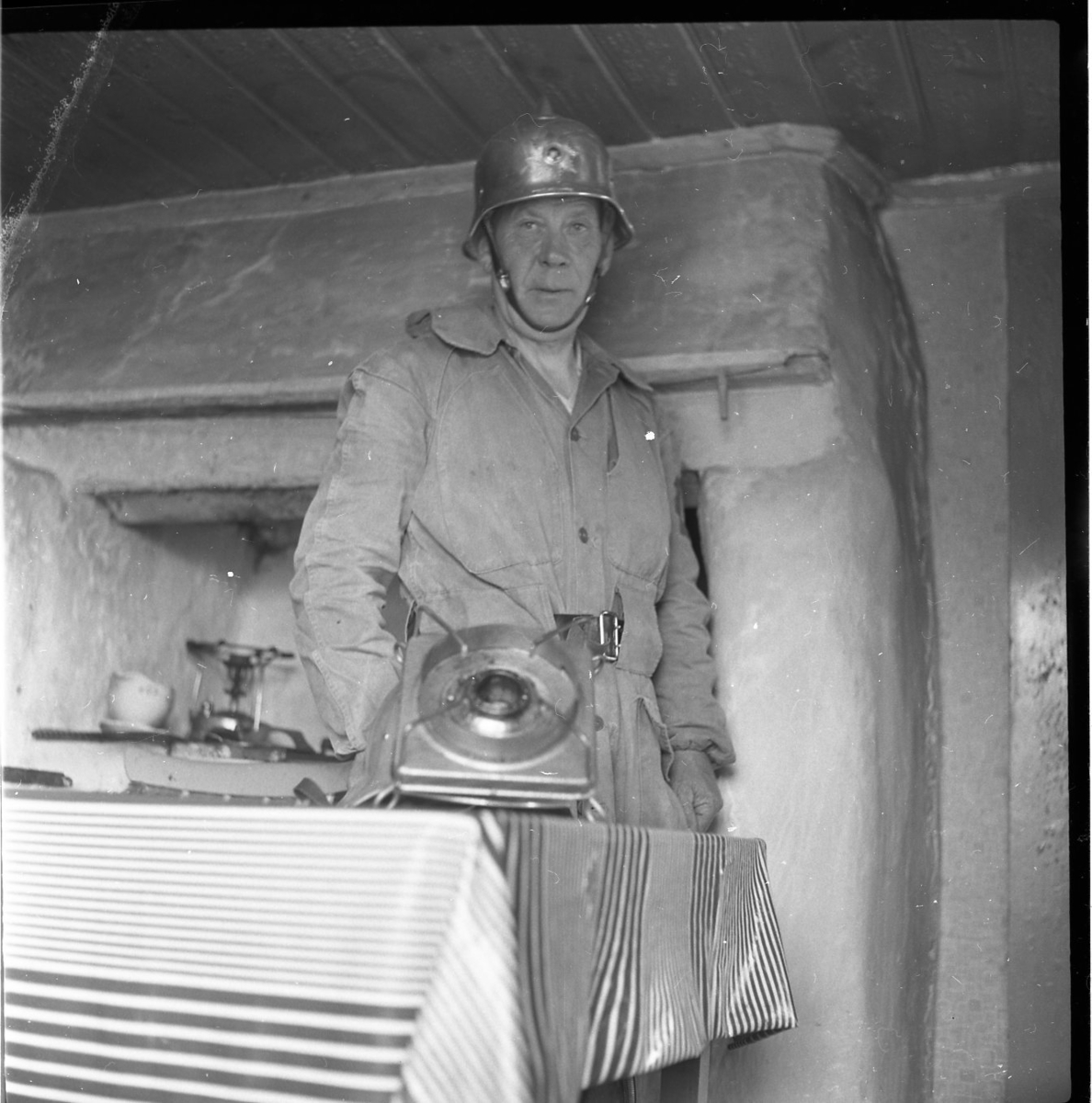 En brandman står i ett kök framför en järnspis. På det dukförsedda bordet framför honom står något som ser ut som en platta till en gasspis.