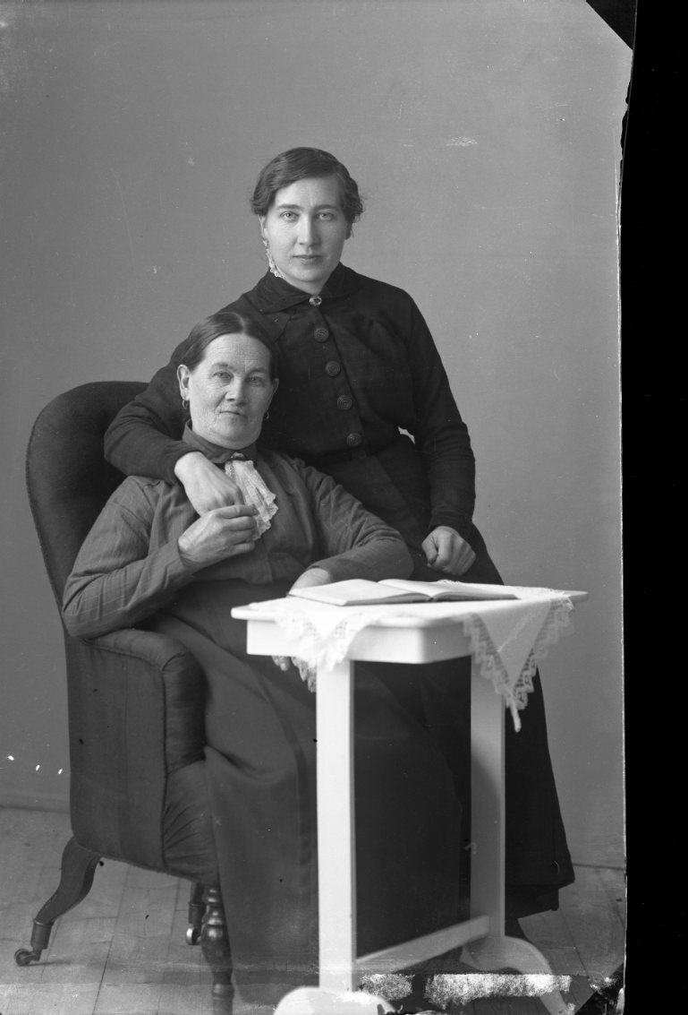 En äldre kvinna sitter i en fåtölj, en yngre kvinna sitter bakom henne på armstödet. De håller varandras hand. Troligen mor och dotter