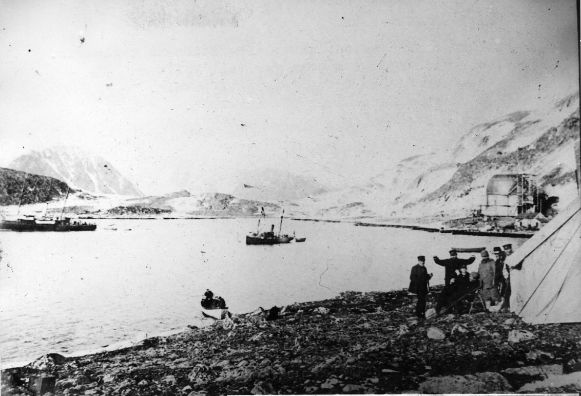 Den så kallade Virgo hamn vid Danskön i Danskegattet. Två fartyg ligger för ankar. Till höger syns ballongen Örnen i ballonghuset som har delvis riven vägg mot norr. I förgrunden till höger ett tält med bland annat "tyska turister".