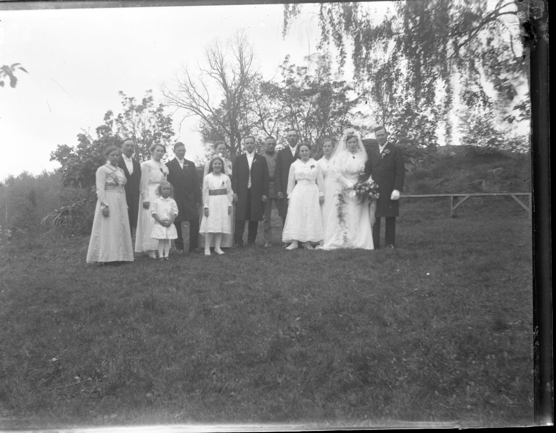 Ett brudpar med gäster uppställda på en grässlänt, möjligen i Anneberg.
