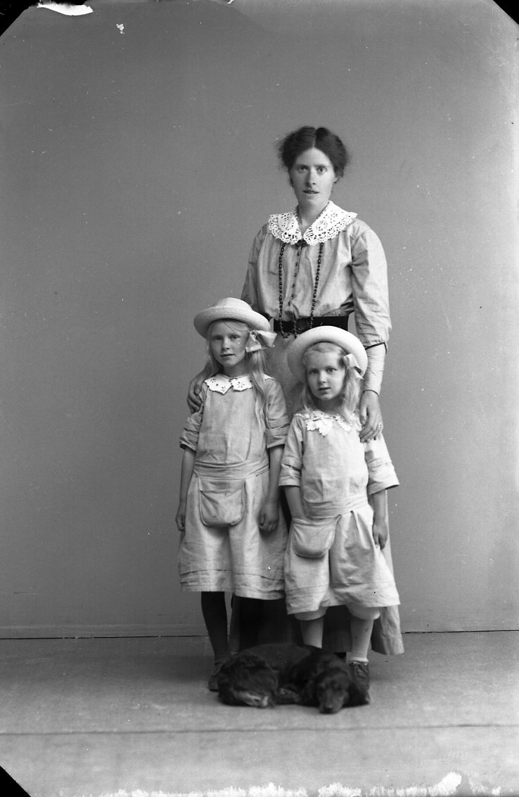 En ung kvinna stående med två små flickor framför sig. Alla har ljus spetskrage och flickorna har hatt.