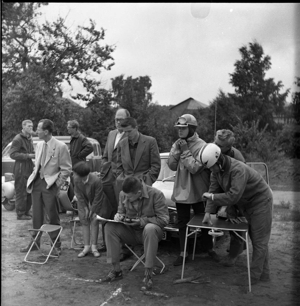 Bilden tagen vid sidan av en motorbana för vespor. Publik står och väntar på att förare på vespor ska passera. En sittande man håller på att antecka något på en skrivskiva. han håller ett tidtagarur i handen.