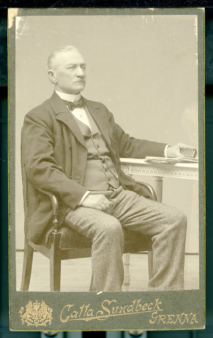 Kabinettsfotografi: A W Hall sittande i en stol vid ett bord, i kostym med udda kavaj, väst och fluga. Vänster arm vilar på ett bord med tidningar och i handen håller han sannolikt en snusdosa.