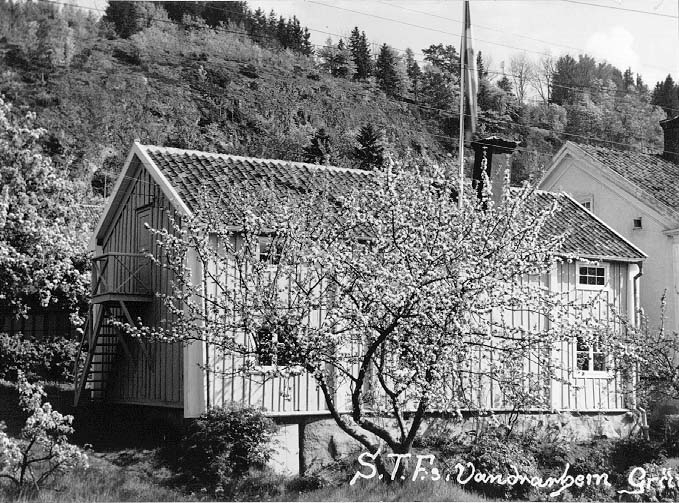 En tvåvåningsbyggnad med locklistpanel och brädfodrade knutar bakom ett blommande fruktträd. På norra gaveln (till vänster) en trappa upp till en dörr på andra våningen.