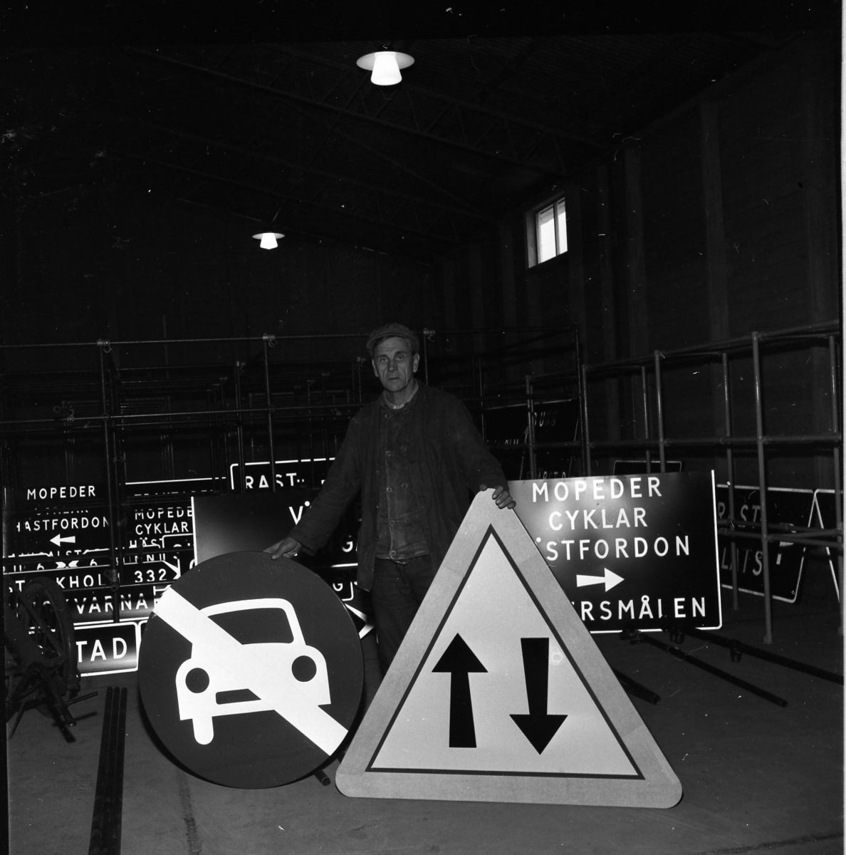 En man står i en förvaringslokal omgiven av vägskyltar. I händerna håller han två trafikskyltar.