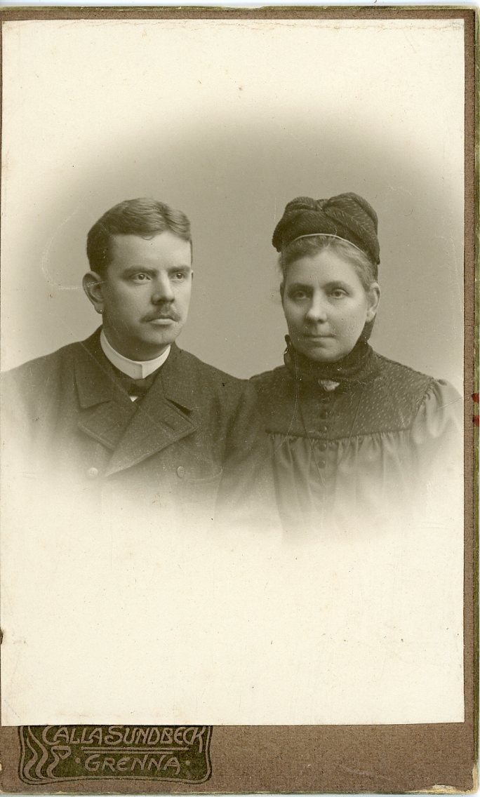 Kabinettsfotografi av en okänd man och kvinna, båda klädda i mörkt och kvinnan med en huvudbonad.