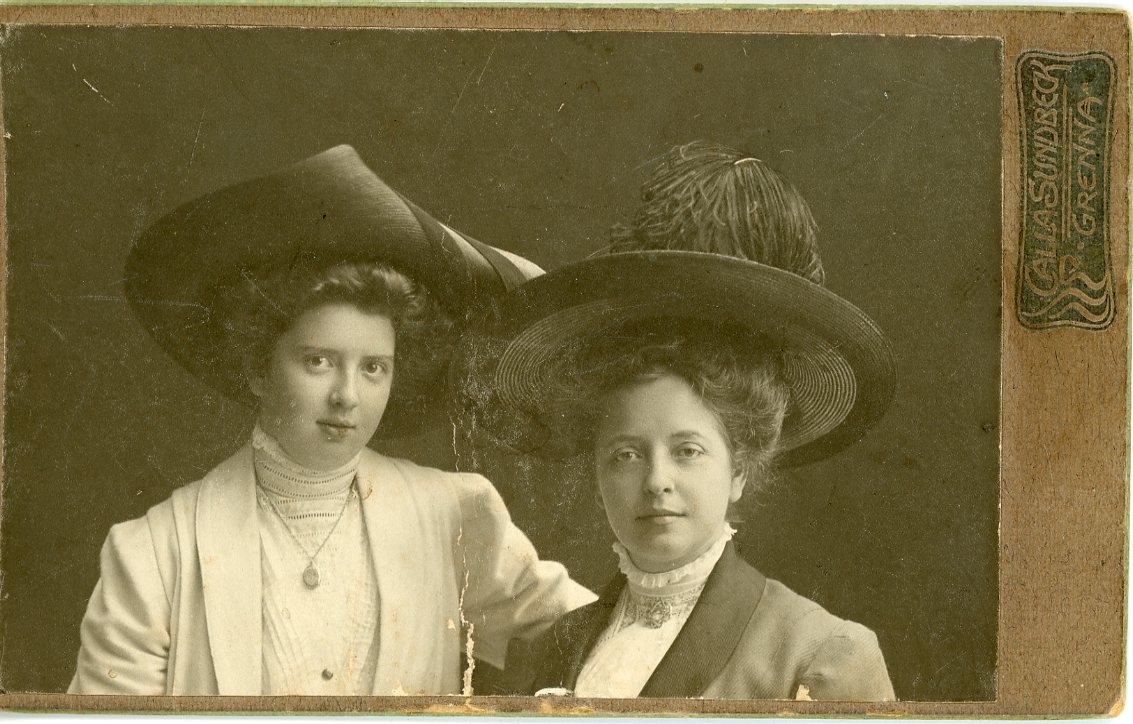Kabinettsfotografi av två okända unga kvinnor med stora hattar.