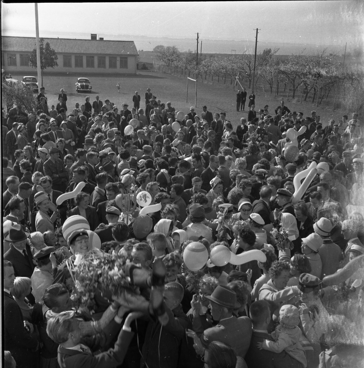 Folksamling vid Realskolan i samband med realexamen. En yngling hissas i luften.