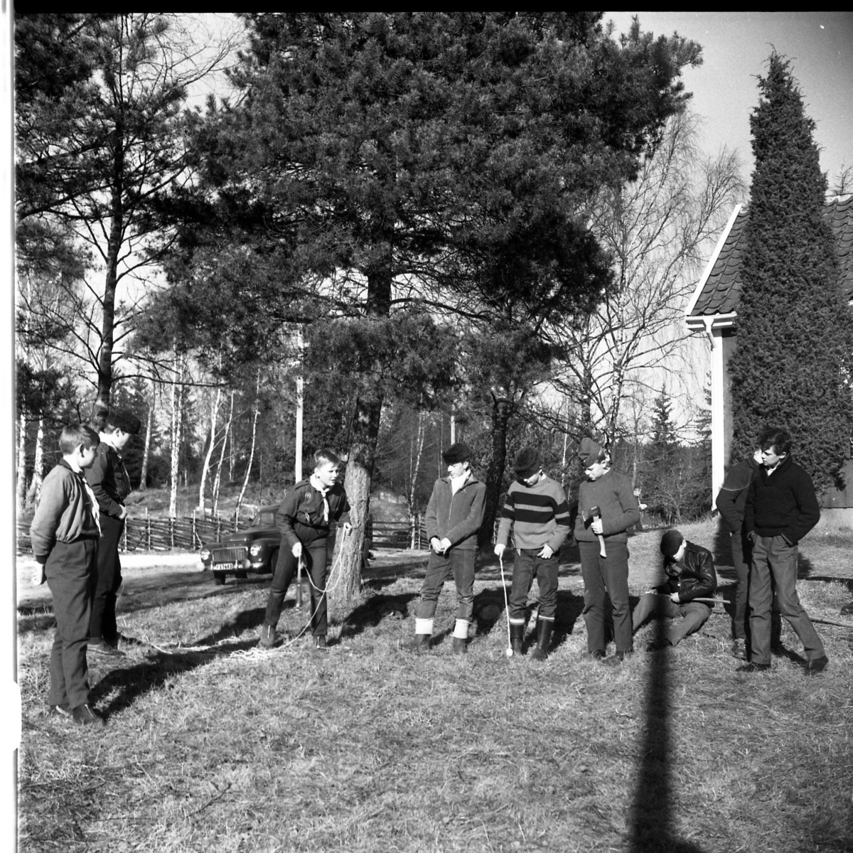 Ett gäng unga scouter står tillsammans under en tall. En kille slungar iväg någonting med hjälp av ett rep. Två utav killarna har pälsmössa på huvudet. En av killarna håller i en yxa.