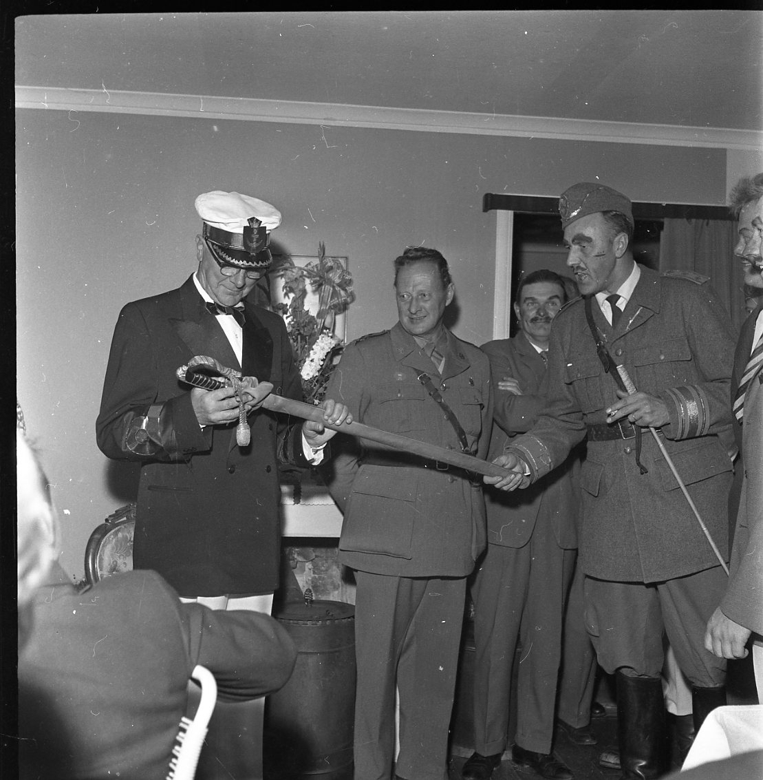 Spex i samband med Osse Gustafssons 60-årsdag. Han står i centrum i mörk kavaj och vit skärmössa och håller i en värja, som han troligen just mottagit. Till höger en man i uniform - Olle Mathias - och sminkat ärr på kinden och ögonbryn.