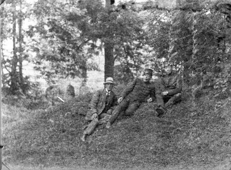 Tre män ligger i en grässlänt. Två av dem bär militär uniform.