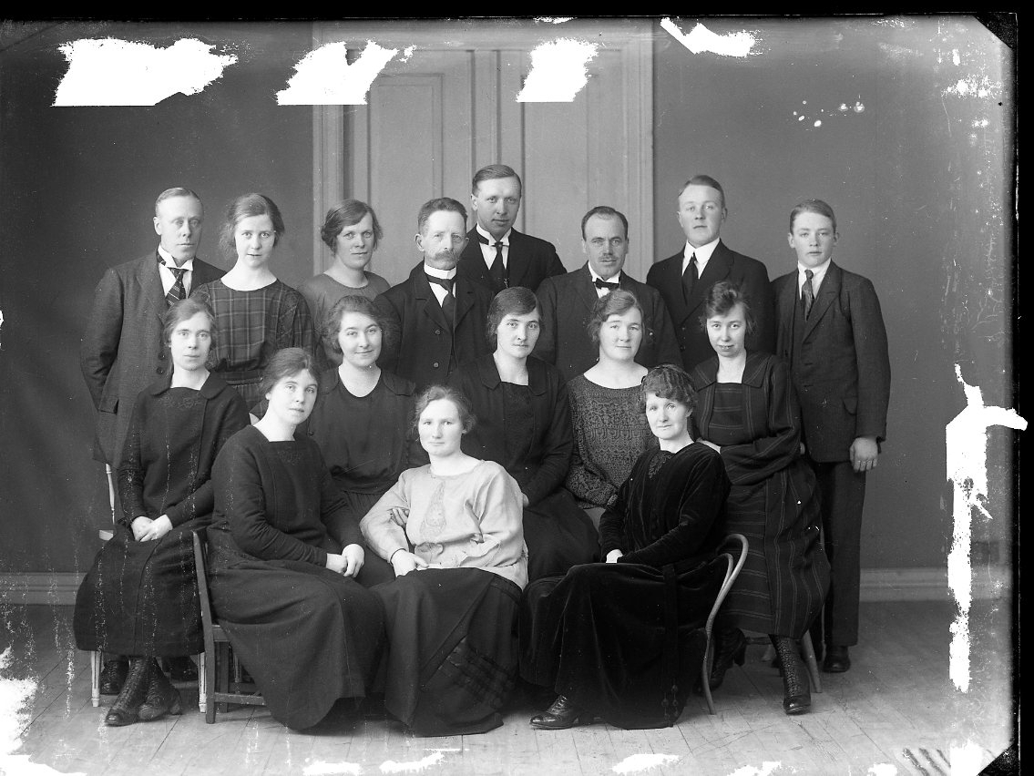 Gruppbild med 16 män och kvinnor. Det är Östanå Missionsförsamlings kör. Sittande fr v: Rebecka Holmkvist, Mina Holmkvist?, Andersson (Stora Roten), Pettersson (Östanå), okänd, Pettersson (Östanå), Nelly Lindkvist (Båget) och Signe Karlsson (Knutstorp). Stående fr v: Sven Agurén (Alboga), Rut Nilsson (Ingeryd), Agnes Karlsson (Knutstorp), Johan Johansson (Kärr), Gunnar Karlsson (Knutstorp), John Agurén (Alboga), Gustav Karlsson (Perstorp) och Filip Johansson (Andersarp)