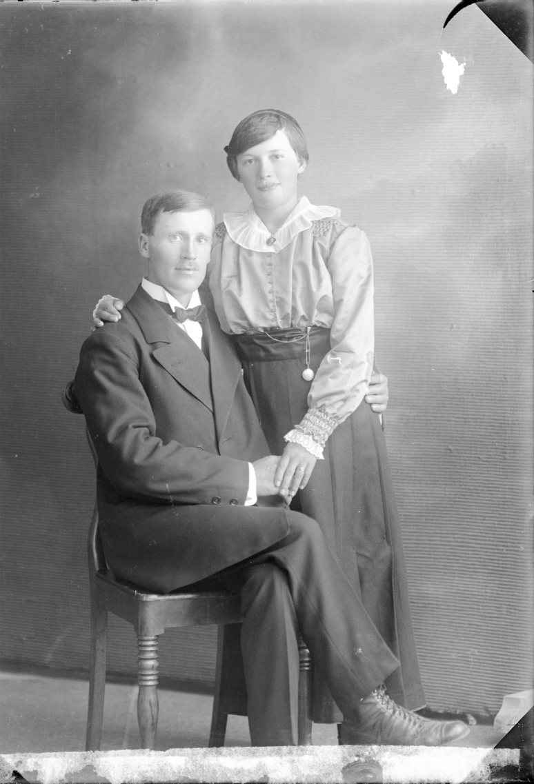 Porträtt av en sittande ung man och en stående kvinna, intill varandra och hållande varandras hand.