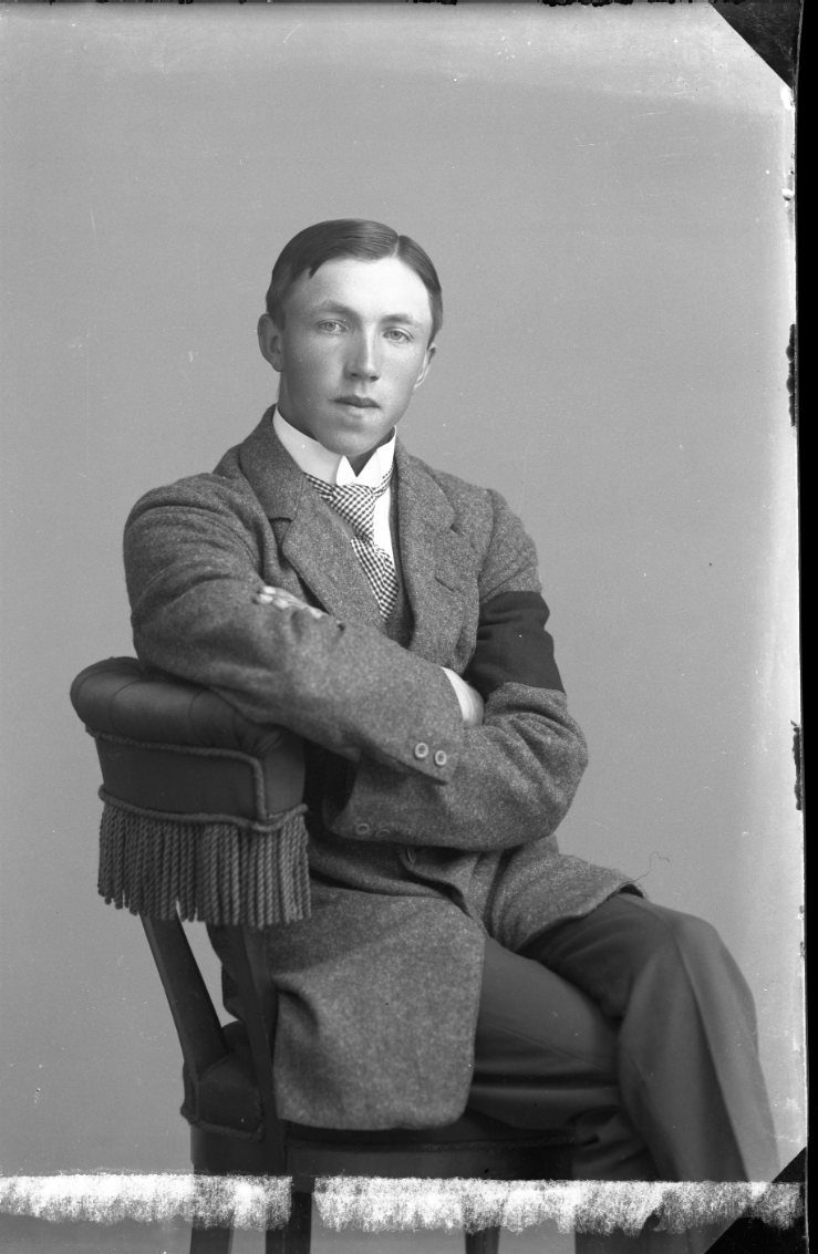 Porträtt av en ung man i finkostym som sitter på en stol med armarna i kors. Han har ett mörkt band runt vänster överarm.