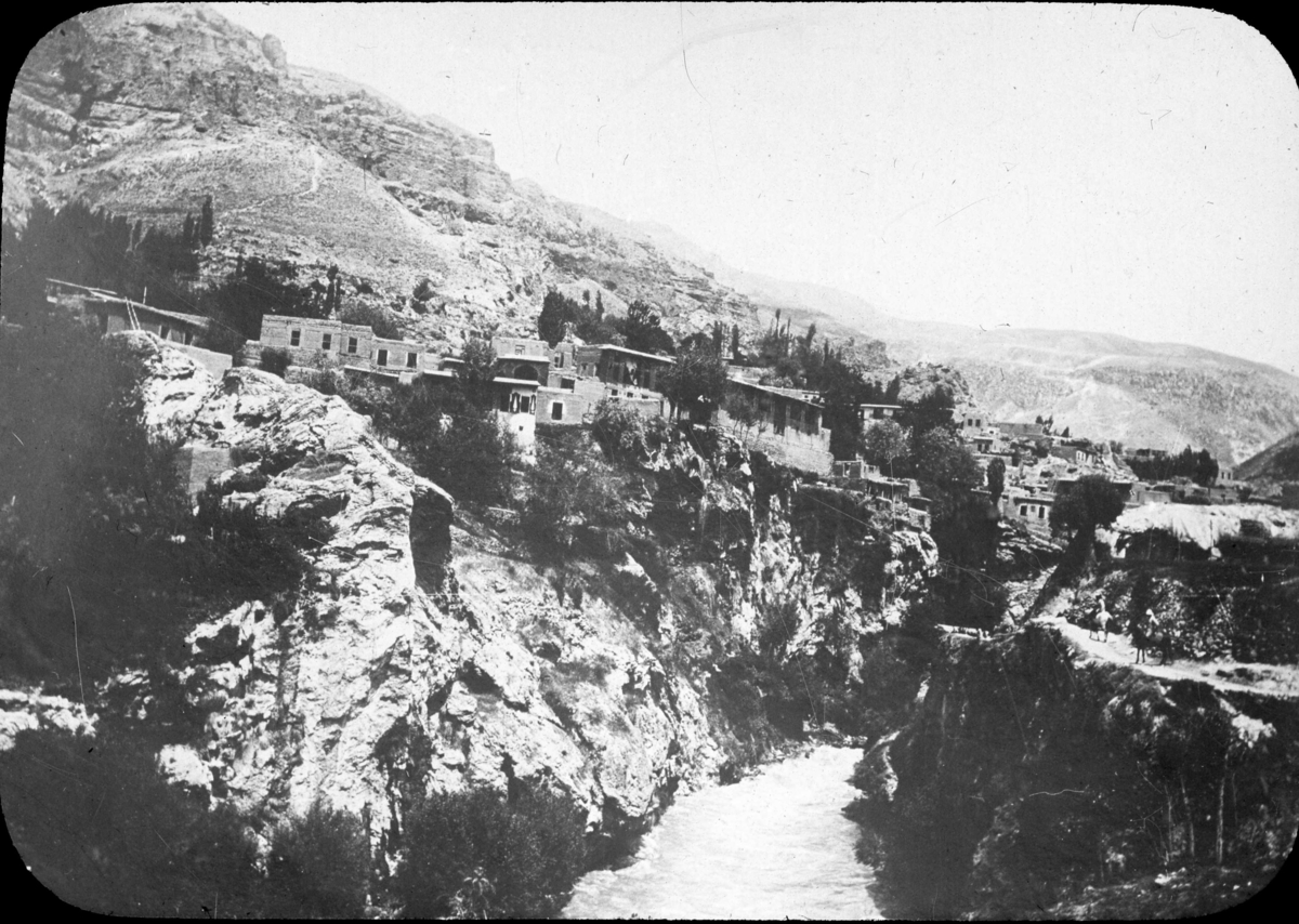 "Landskapsbild: Rescht - Kazvin." (Rasht-Qazvin) Bergigt landskap på vägen mellan Rescht och Kazvin. Djup ravin med vattendrag och bebyggelse på dess vänstra sida. Två personer till häst på andra sidan ravinen.