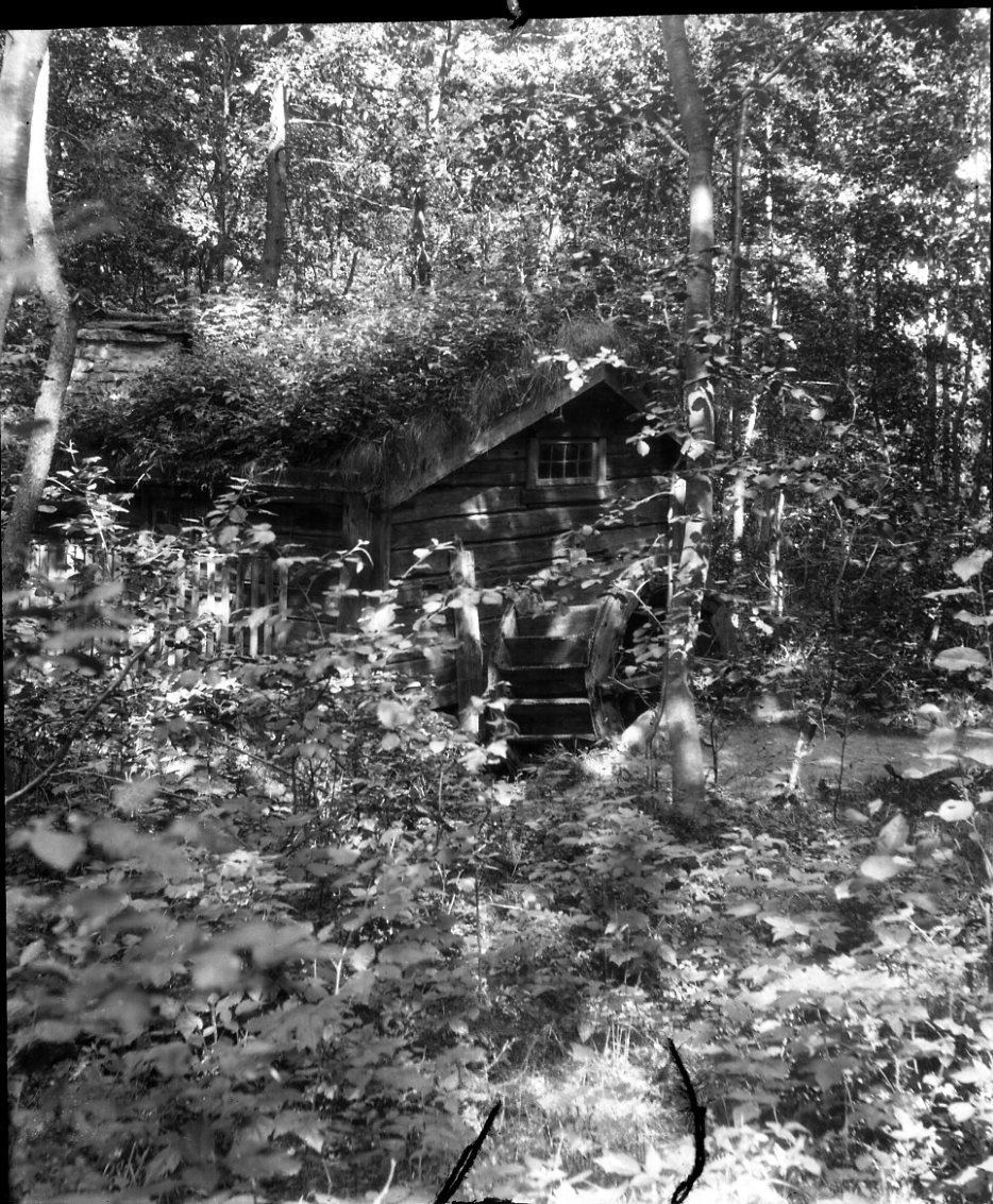 En liten knuttimrad byggnad med vattenhjul, knappt synlig bakom grönskande träd och buskar. Det är ett tråddrageri.