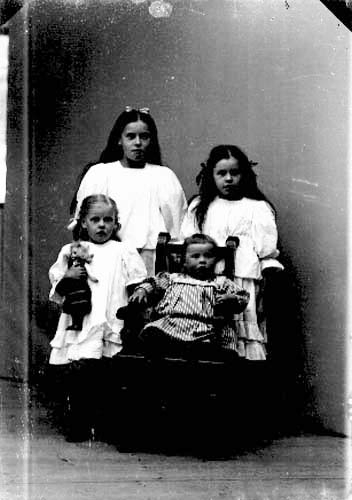 En syskongrupp. Tre flickor varav den yngsta med en docka i famnen och en liten pojk som sitter på en stol.