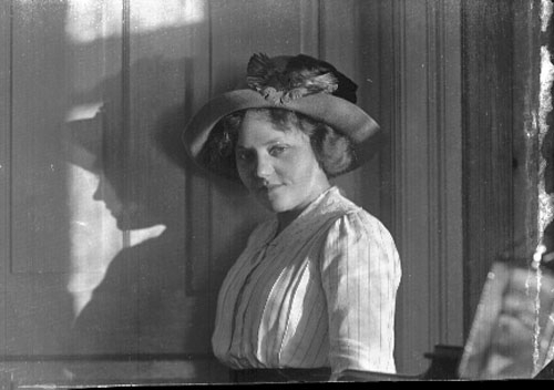Bröstbild av en ung kvinna i ljust randigt livstycke och stor hatt. Hon står lite i profil mot en vägg. Hennes skugga faller till vänster på bilden.