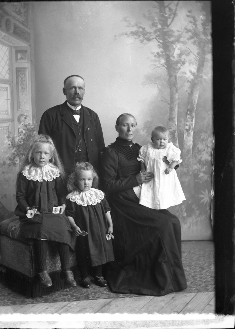 Gruppbild med man, kvinna och tre barn. Den minsta håller hon i famnen. Familjen Axel Carlsson i Ed, Visingsö