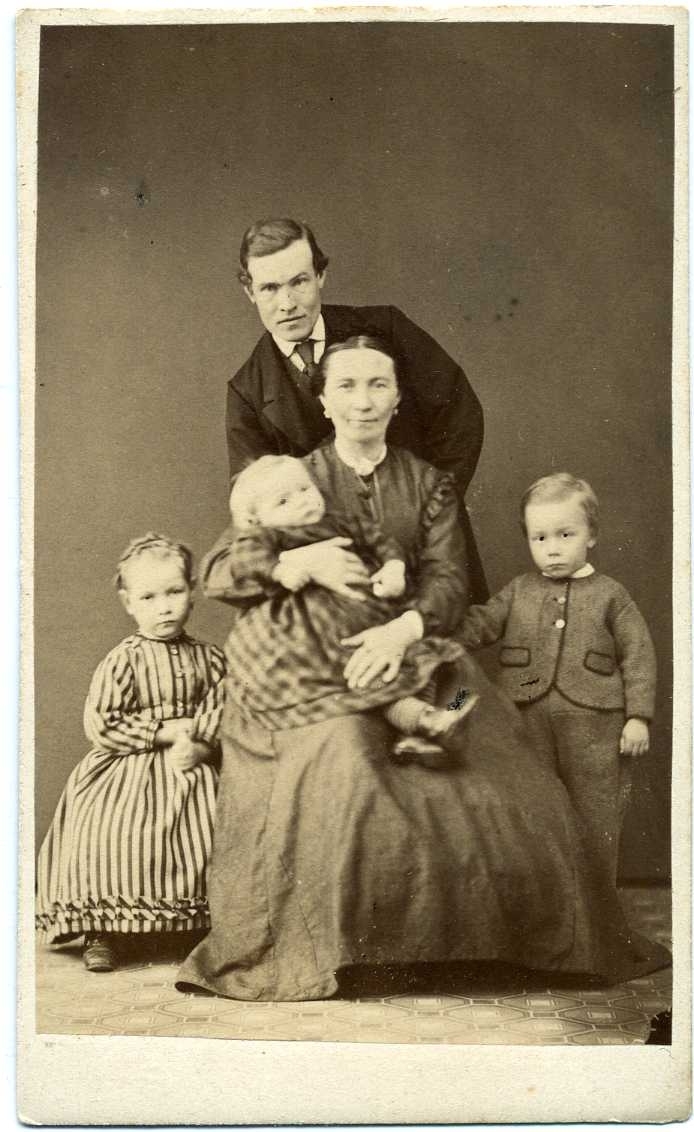 En familjegrupp. En kvinna sitter med ett litet barn i sin famn. En flicka står vill vänster om henne och en pojke till höger. Bakom dem lutar sig en man lätt över dem.