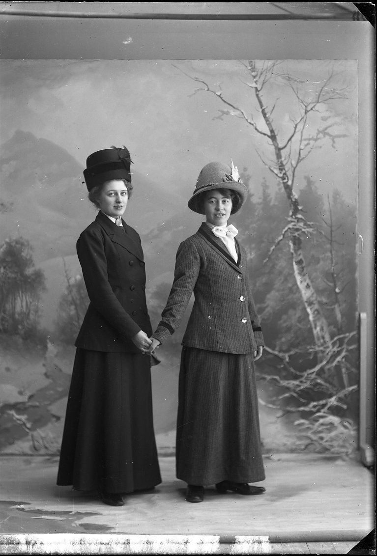 Två unga kvinnor i vinterplagg, de håller varandra i handen.
