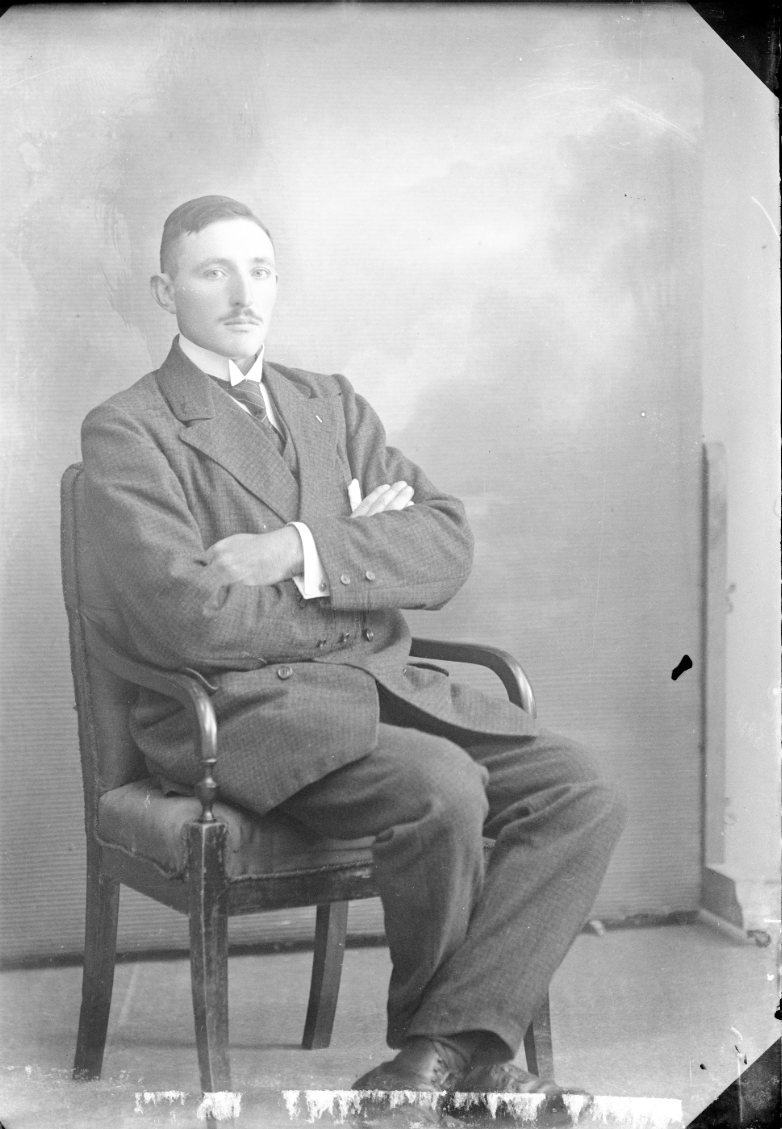 Porträtt av en ung man med mustasch som sitter på en stol med armarna i kors.