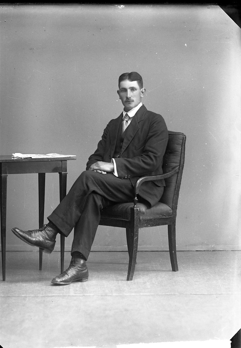 En man sitter vid ett bord med händerna i knät. Det ligger en tidning på bordet.