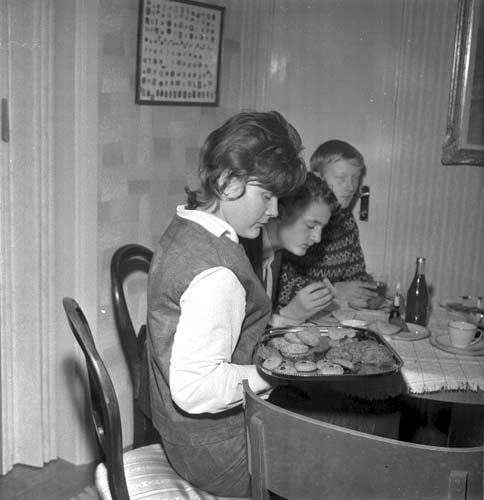 Tre perosner sitter vid ett fikabord. Ett kakfat skickas runt.