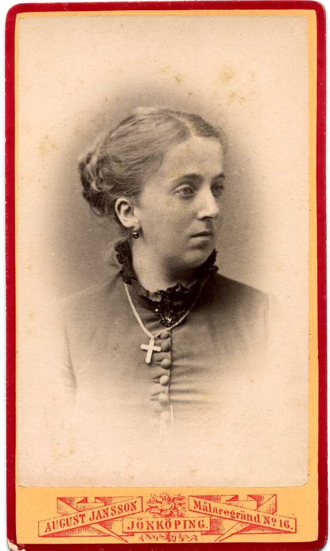 Kabinettsfotografi av en kvinna med håret uppsatt i knut. Halsband med kors.