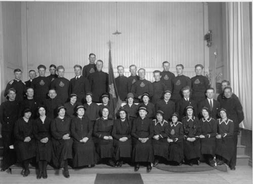 Gruppbild med ett stort antal kvinnliga och manliga frälsningssoldater.