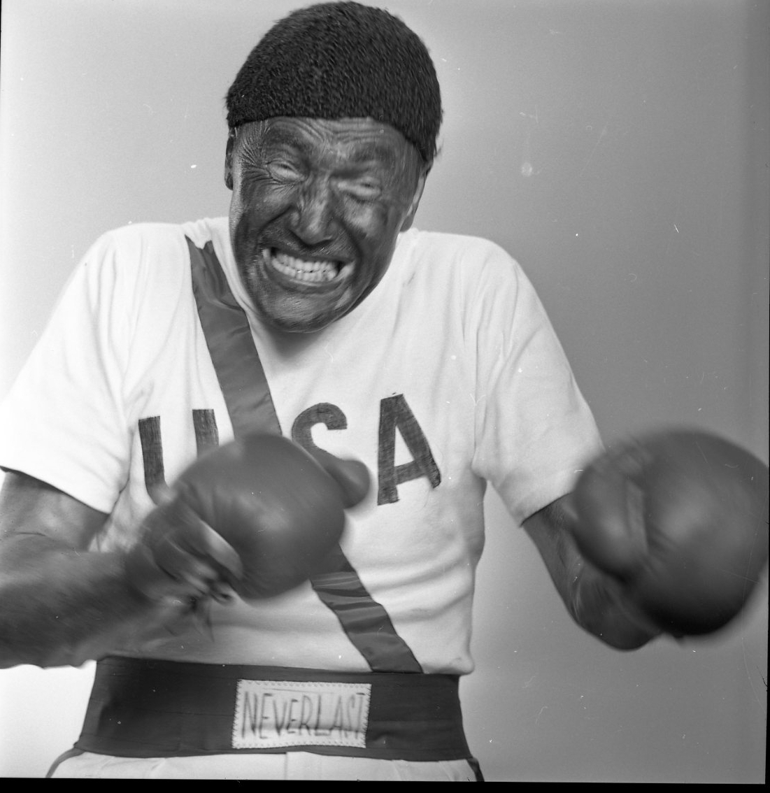 Titel: En man med mörkt sminkat ansikte, svart peruk, boxarhandskar och en t-shirt märkt "USA". Han agerar boxaren Floyd Patterson.