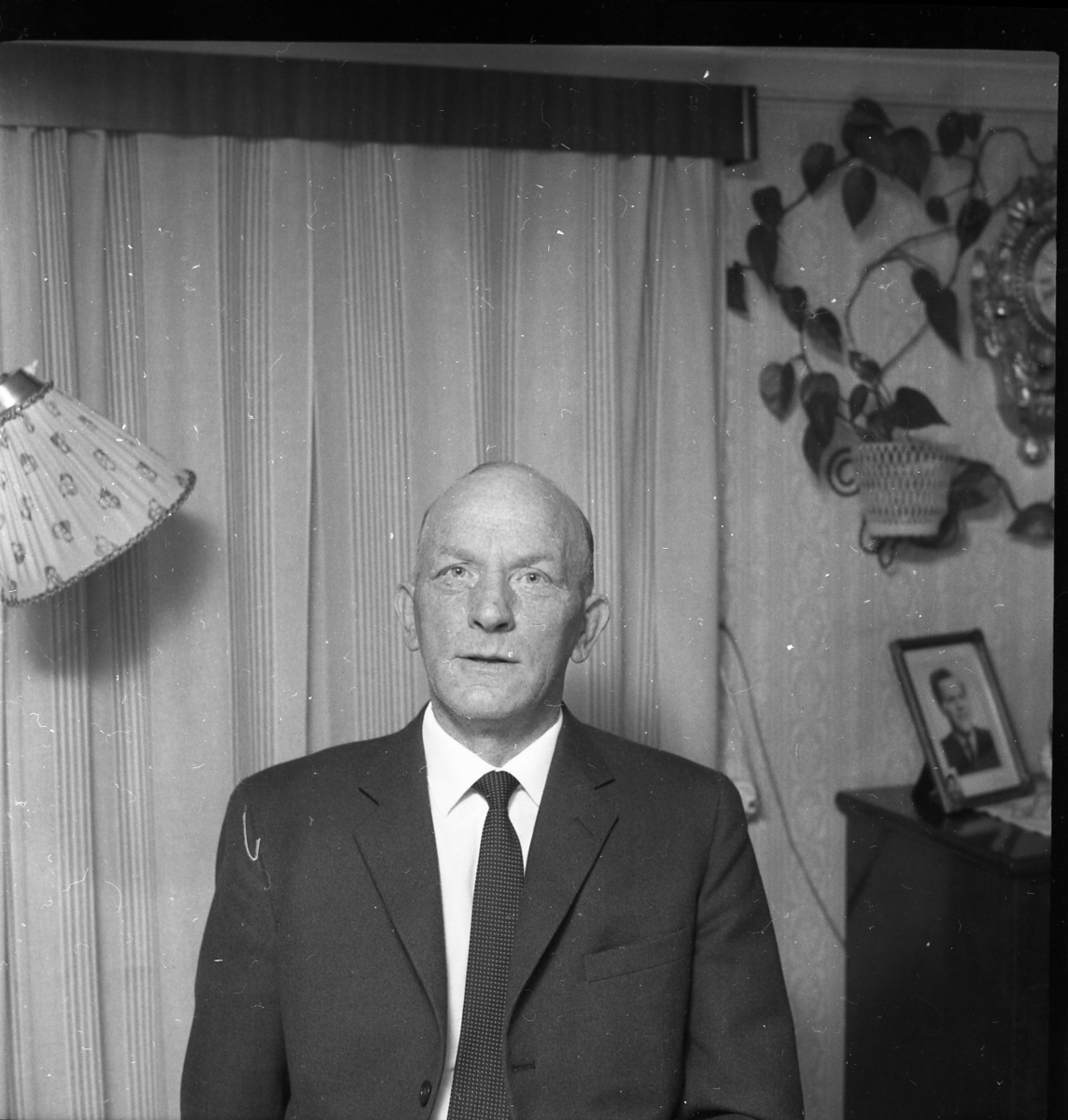 Titel: Porträtt av en man som sitter i en hemmiljö. Han bär kavaj och slips.