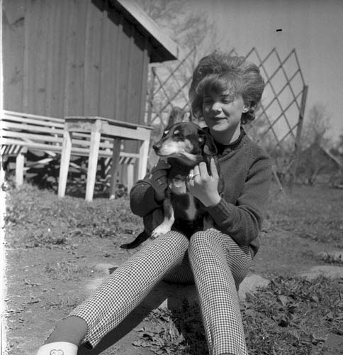 En kvinna sitter på marken, hon håller en hund i famnen. Hon har tuperat hår och och stickad tröja.