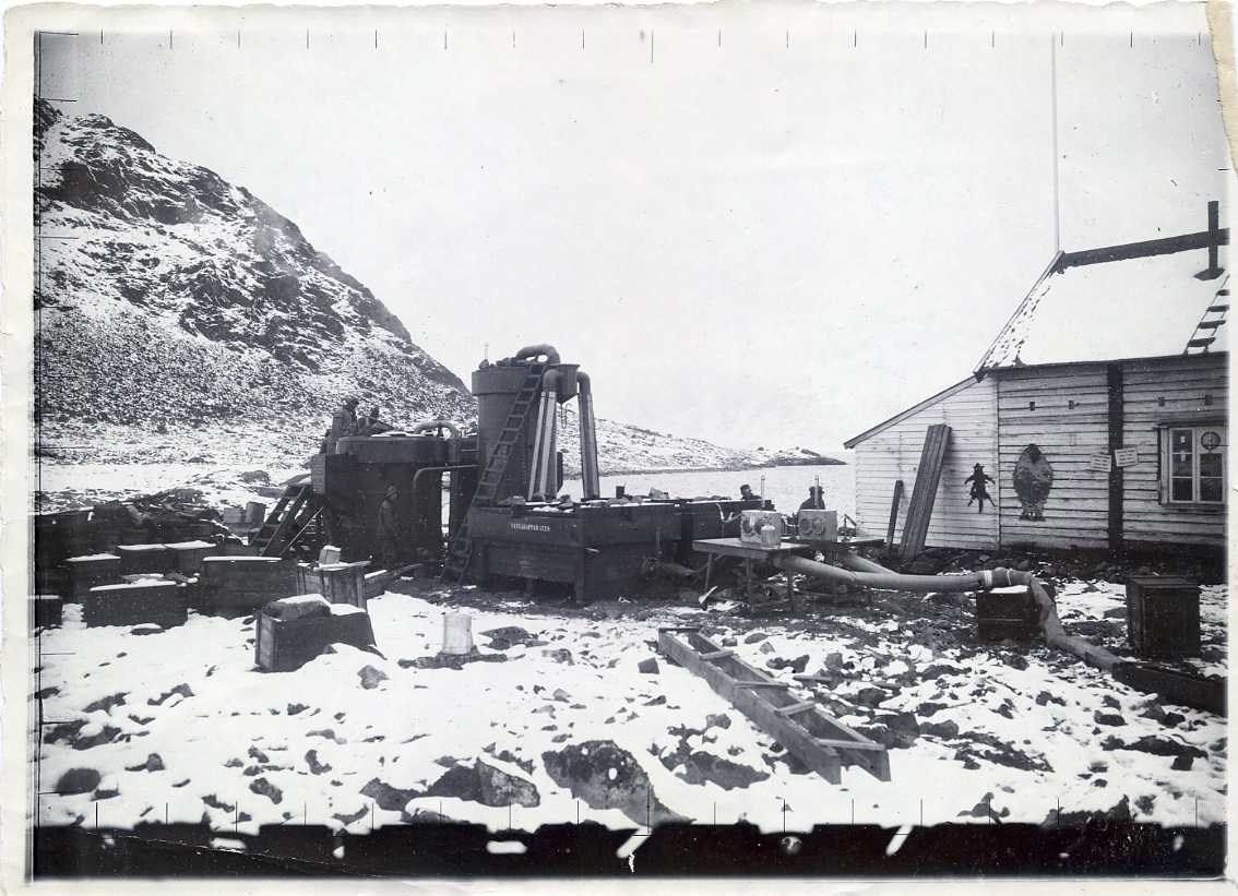 Vätgasapparaten Danskön, män i regnplagg står intill. Pikes hus till höger. Snö på marken.