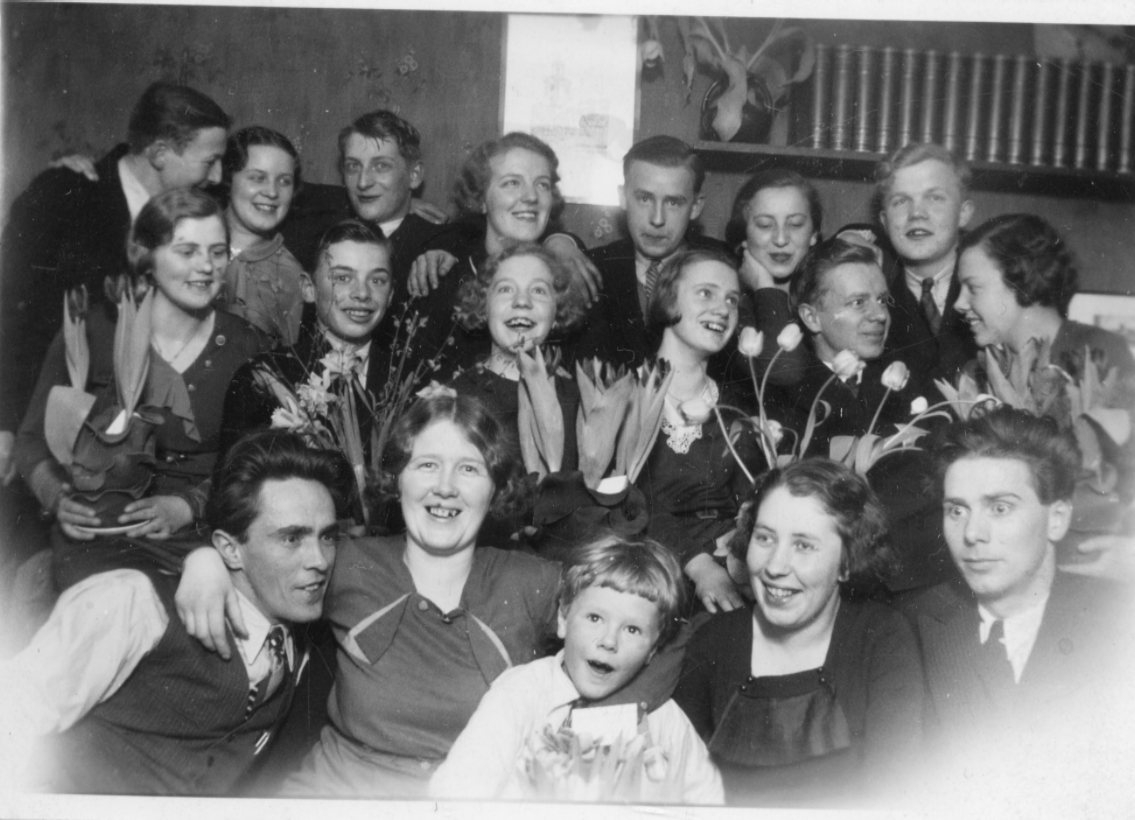 Ett glatt sällskap med unga kvinnor och män, flera med blommor i händerna. De är medlemmar i nykterhetslogen SGU.