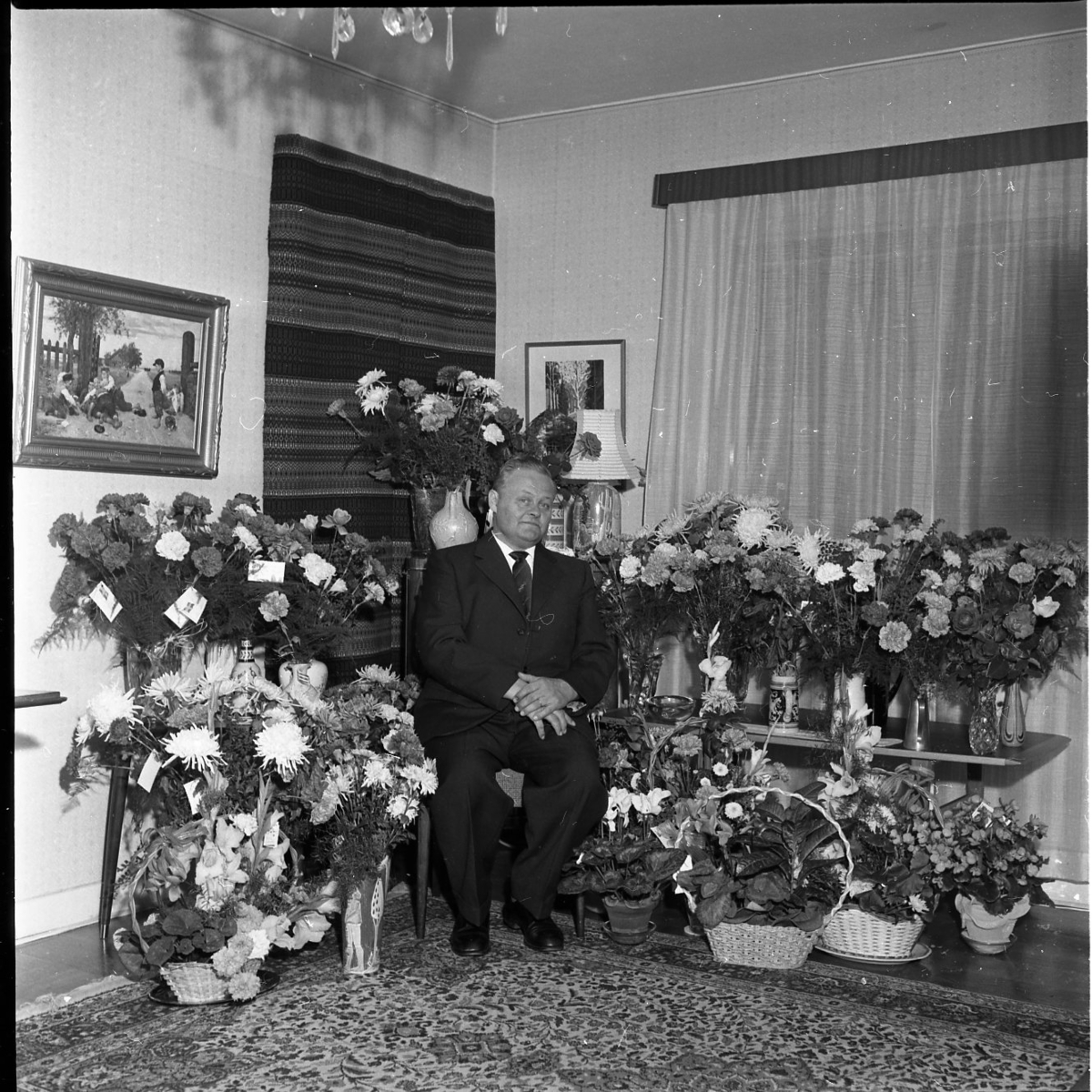 Gunnar Persson sitter i sitt hem omgiven av ett stort antal blomsterbuketter. Till vänster på väggen hänger tavlan "Grindslanten".