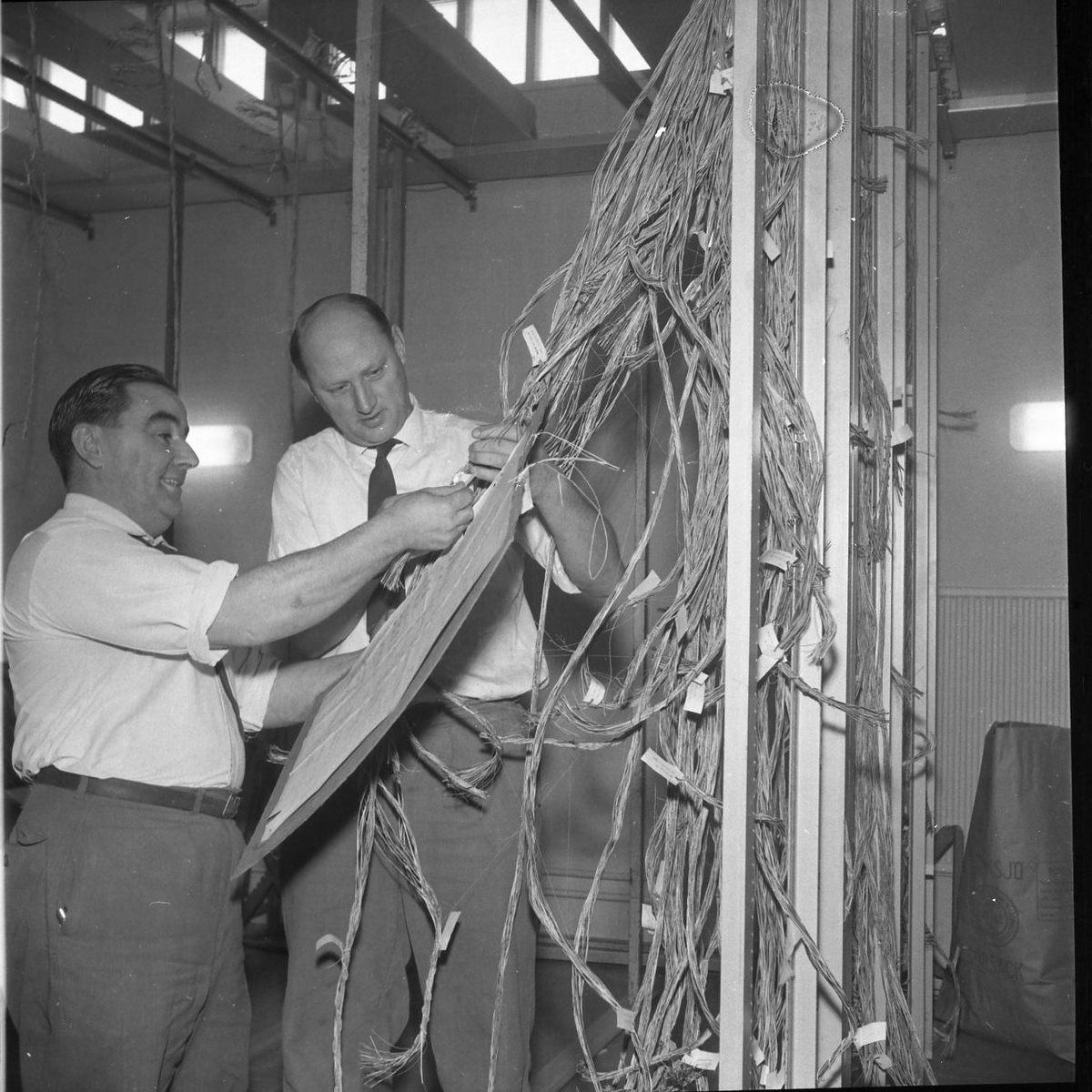 Två televerksmontörer, i vit skjorta med uppkavlade ärmar och slips, kopplar ihop kablar i riktnummerstationen i televerkets nya byggnad i Gränna. Männen är från vänster Åke Andersson och Bertil Melin.