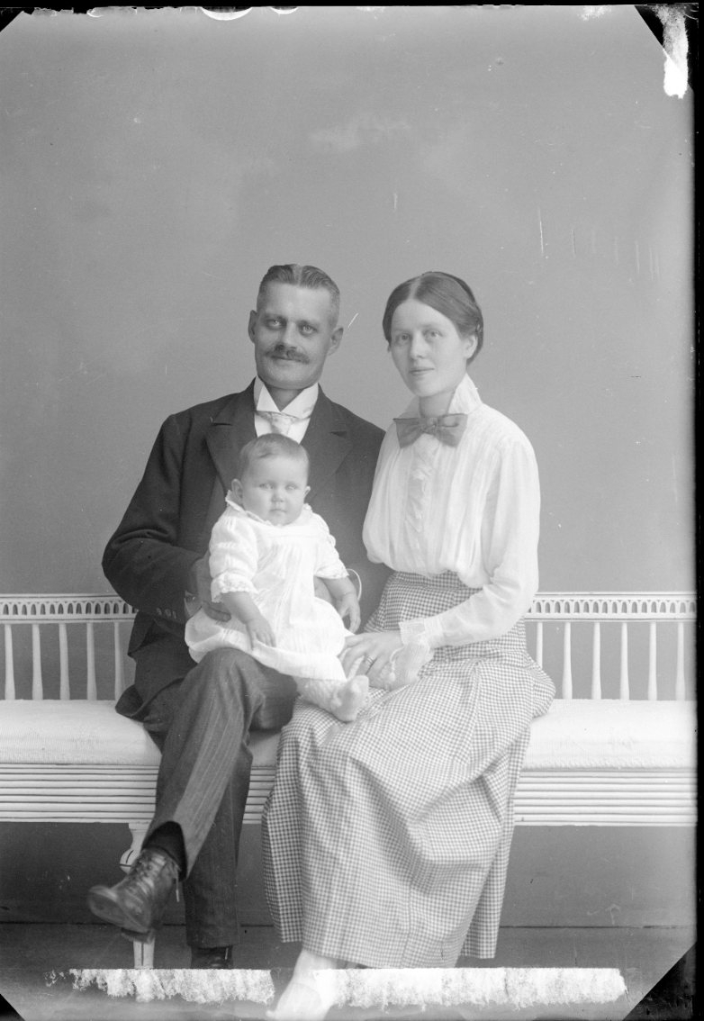 En man och en kvinna med ett spädbarn. De sitter i en soffa av gustaviansk modell.