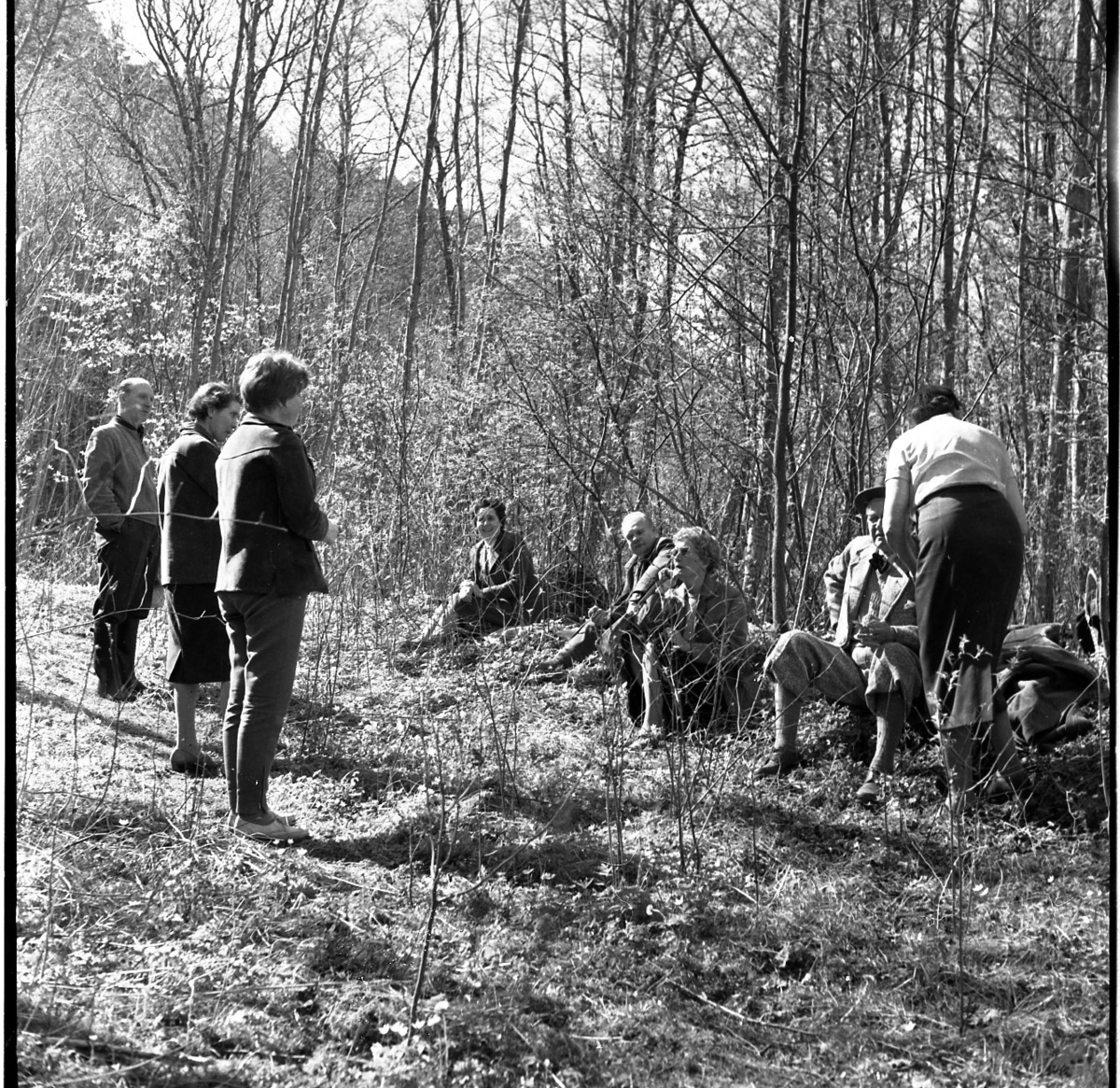 Kvinnor och män i en solig skogsglänta.