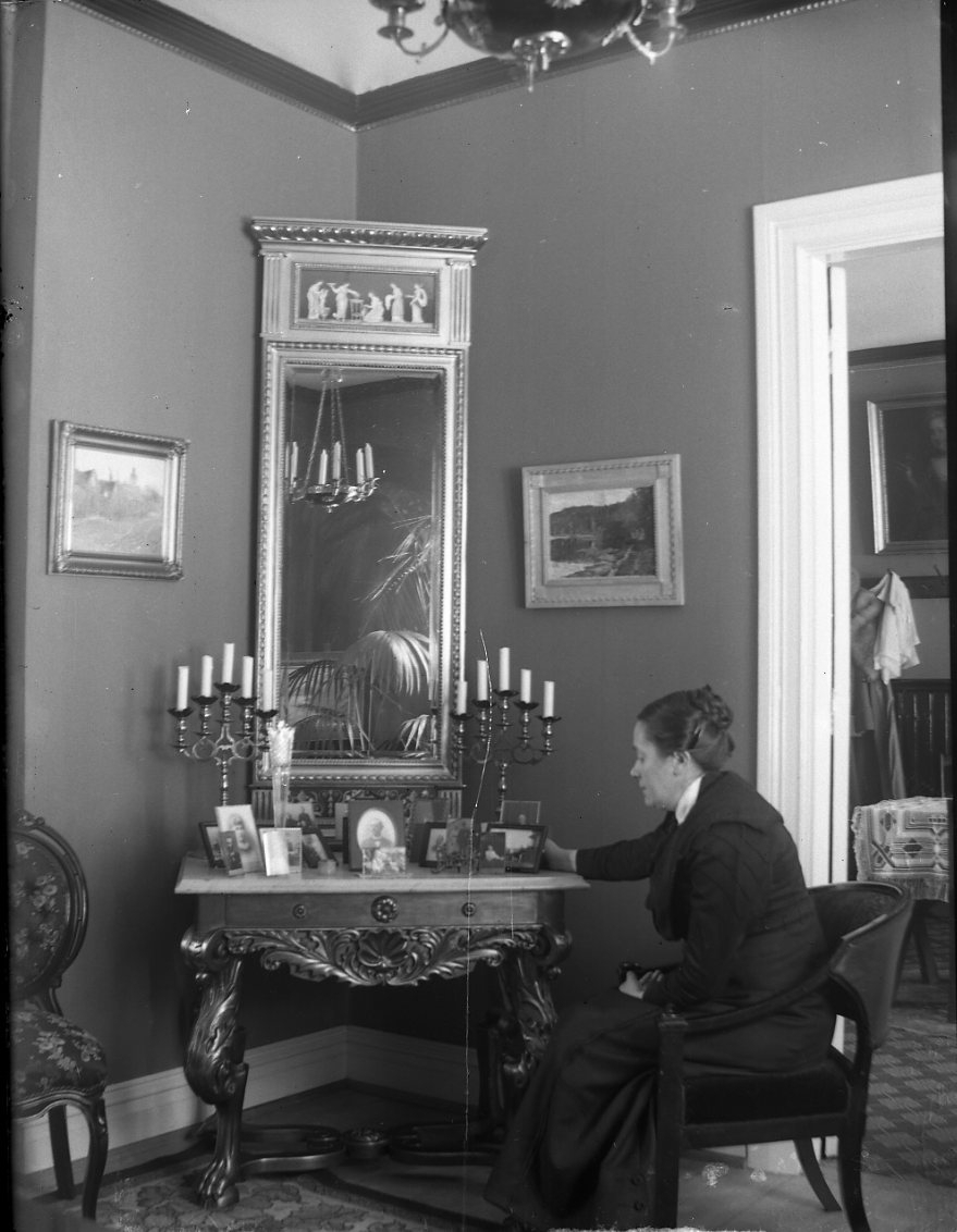 Interiör från fru Berta Bergins hem i Gränna. Berta Bergin sitter vid ett spegelbord och tittar på inramade fotografier.