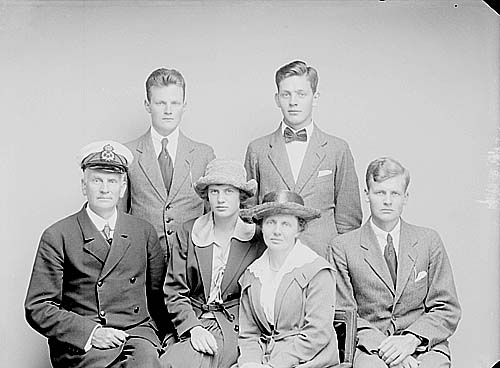 Gruppbild med en man, en kvinna och fyra ungdomar, sannolikt familjen Dahlgren från Karlstad. Mannen bär skärmmössa med emblem för KMK (Kungliga Motorbåt Klubben)
