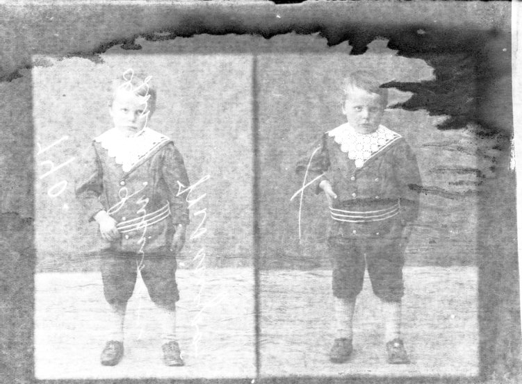 Två porträtt av en liten pojke på en glasplåt. Han håller handen i sitt bälte.