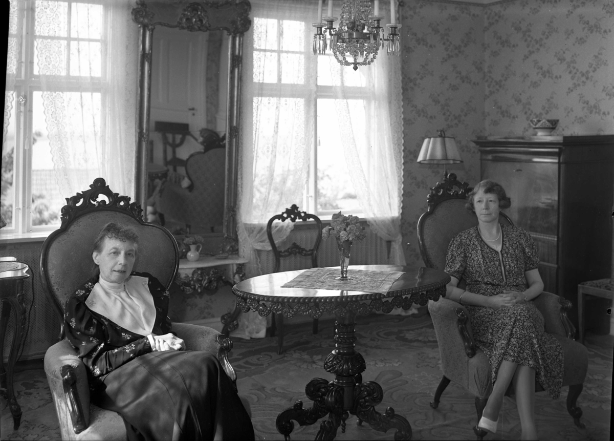 Interiör från en villa. Två kvinnor sitter i varsin emma vid ett ovalt bord som står under en kristallkrona med stearinljus. En hög väggspegel mellan två fönster