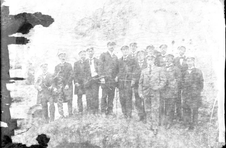En större grupp män med liknande studentmössa på huvudet. De står på ett valv i Visingsborgs slottsruin