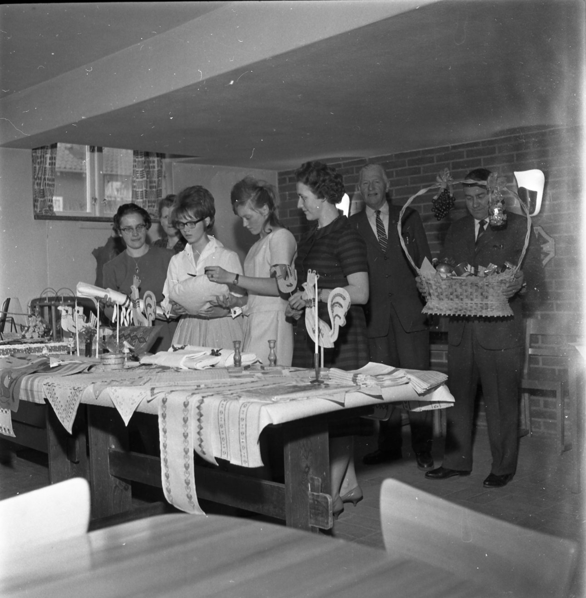 Fem kvinnor står bakom ett bord där det ligger flera broderade dukar. En man står och håller i en fruktkorg. Möjligen ett vinstbord till lotteri.
