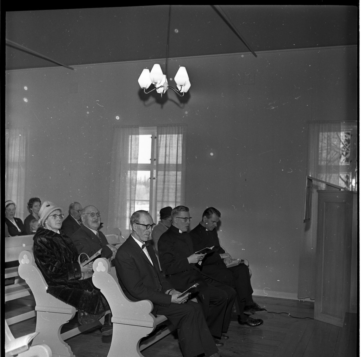 Finklädda människor sitter i bänkar. I den främre bänken sitter två män med prästkrage.