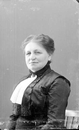 Bröstbild, 3/4-profil, av sittande kvinna i mörkt.