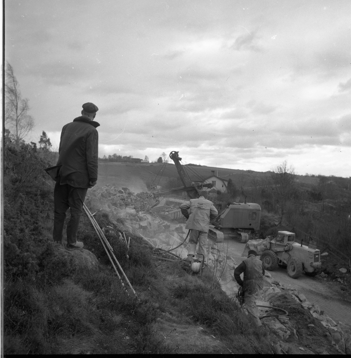 Grävmaskin och andra vägmaskiner i arbete vid Galgen i samband med motorvägsbygget vid Gränna/Röttle, etapp II. En okänd man står på en höjd till vänster och tittar mot arbetsplatsen. Vid huset står en polisbil - Volvo Amazon.