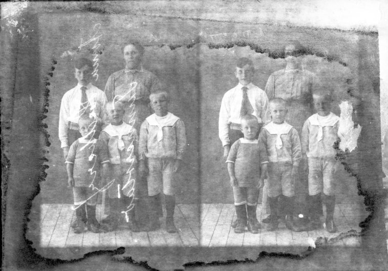 Gruppbild av en kvinna med fyra pojkar i olika åldrar.