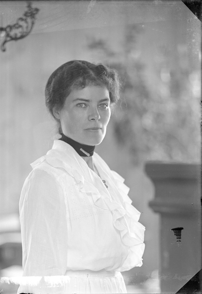 Porträtt av en kvinna i ljus klänning med mörkt band runt halsen.